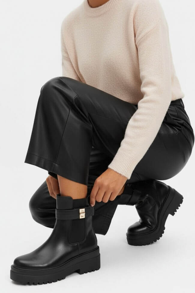 - Dacă îți plac piesele minimaliste, poți alege modele mai clasice, cum ar fi biker boots în paletă monocromă, care se potrivesc cu orice.