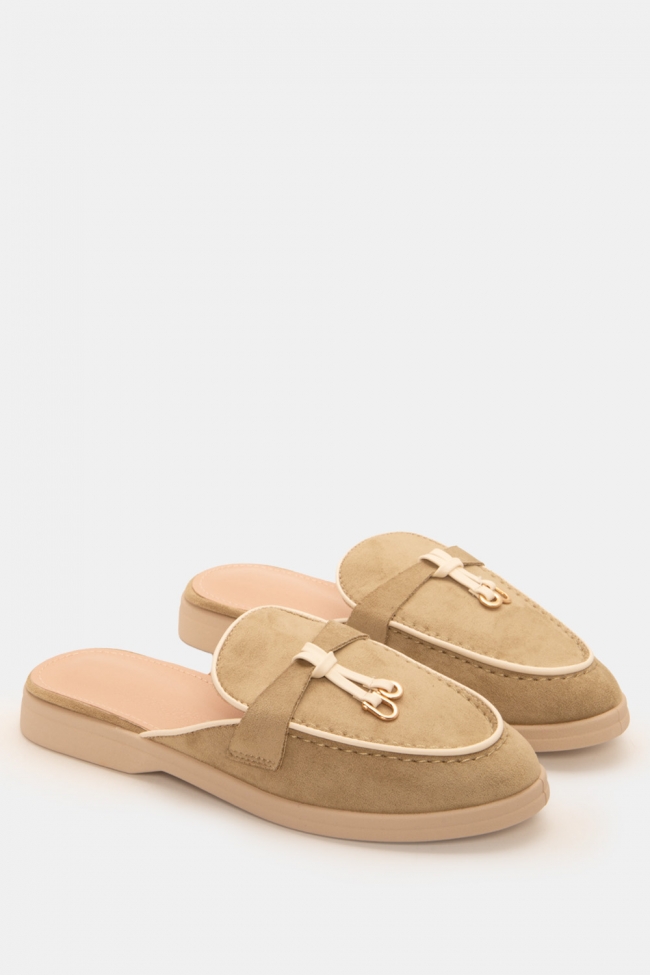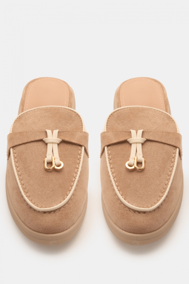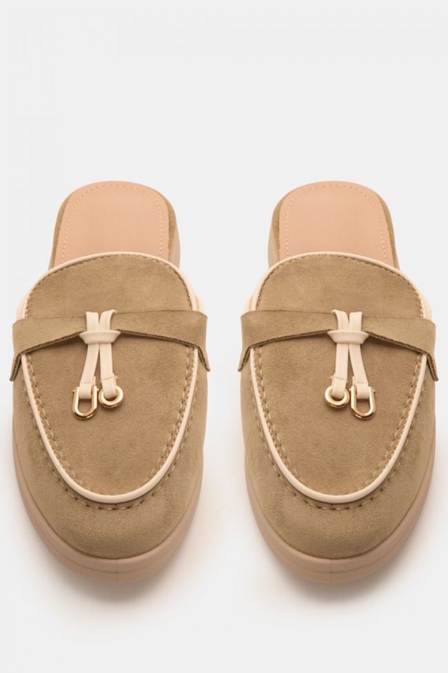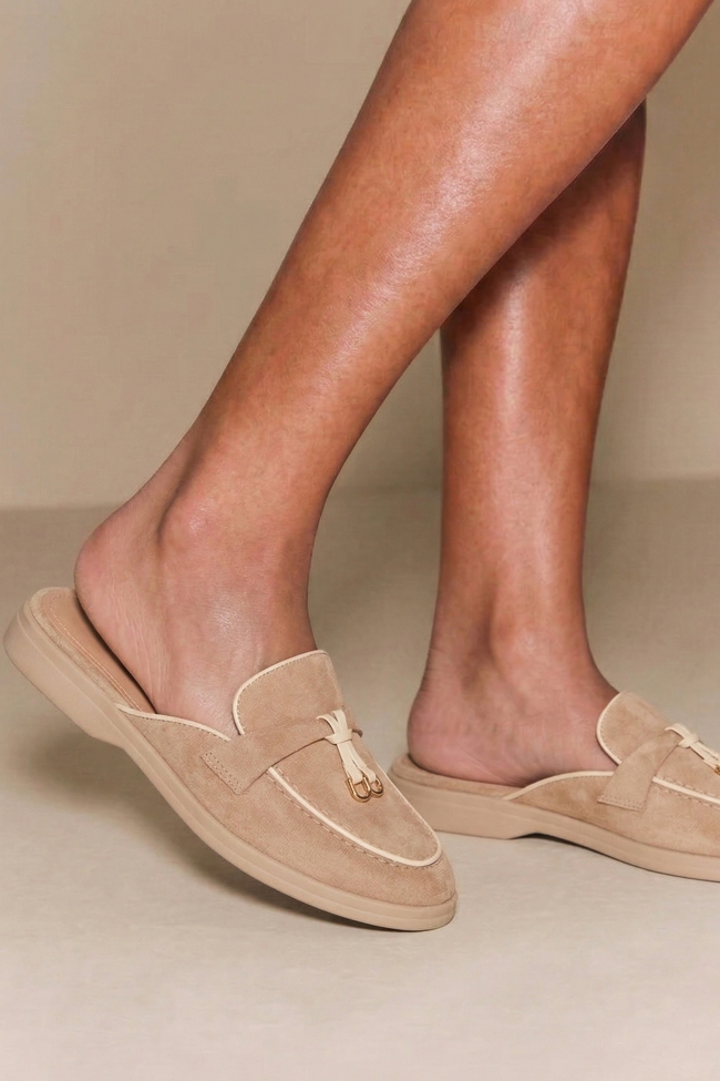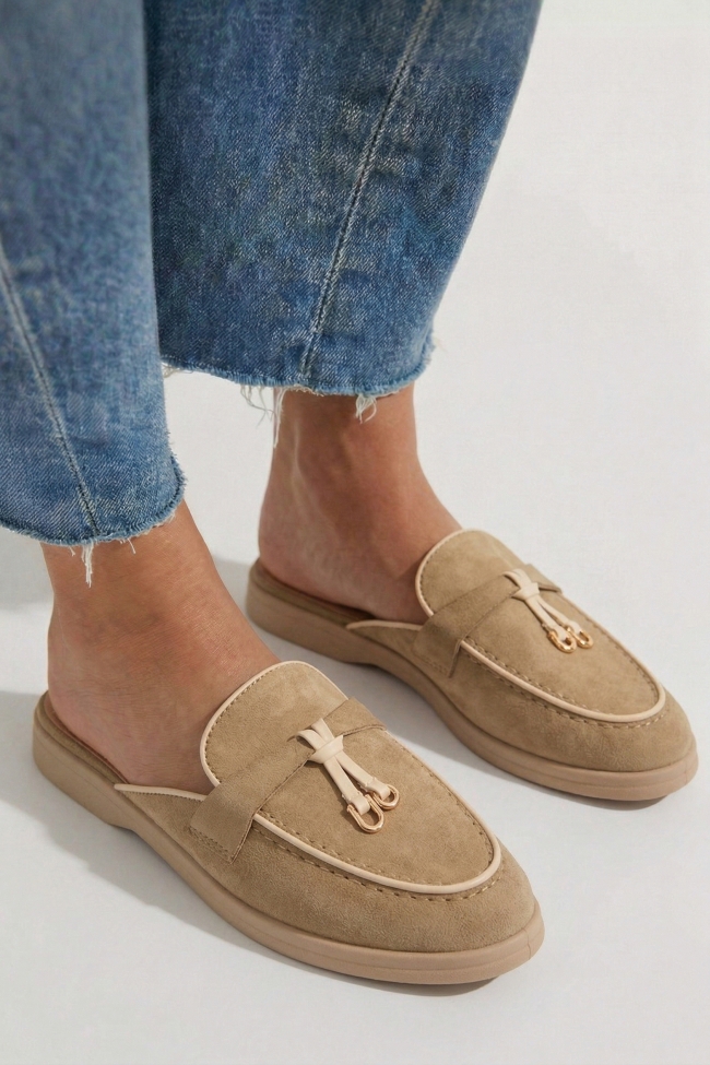 Per passeggiate quotidiane o caffè con le amiche, i mules chiusi piatti con texture in suede sono la scelta migliore. Abbinali con jeans a zampa e una camicia oversize con motivo floreale. Aura Primavera Fresca!